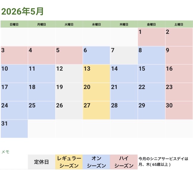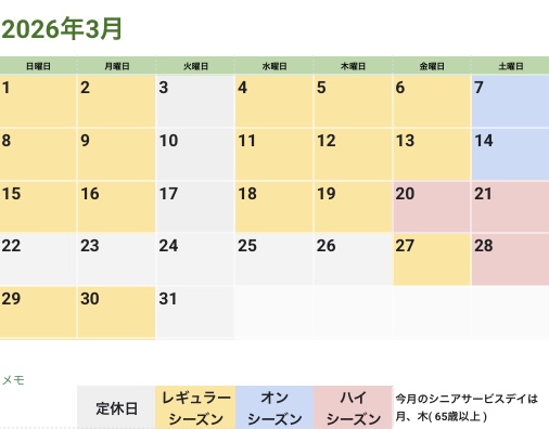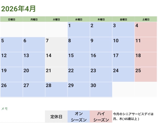 65歳以上の利用者がいる場合、平日のサービスデイに限り2,000円引きします。尚、”グリーンサイト”は対象外となります。ご了承ください。